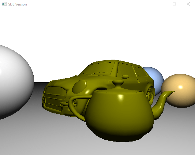 The program when submitted allowed the user to do many things. They can move the camera in all directions, increase/decrease the reflections and shadows rate and even change to any of the three scenes to show the effect of the optimisation techniques. The simplest image (just spheres with no shadows and no reflections) is able to be rendered at around 30 fps. The most complex scene (object with 36,000 triangles with reflections only) takes around 0.1-0.3 seconds each frame instead of 40 seconds.